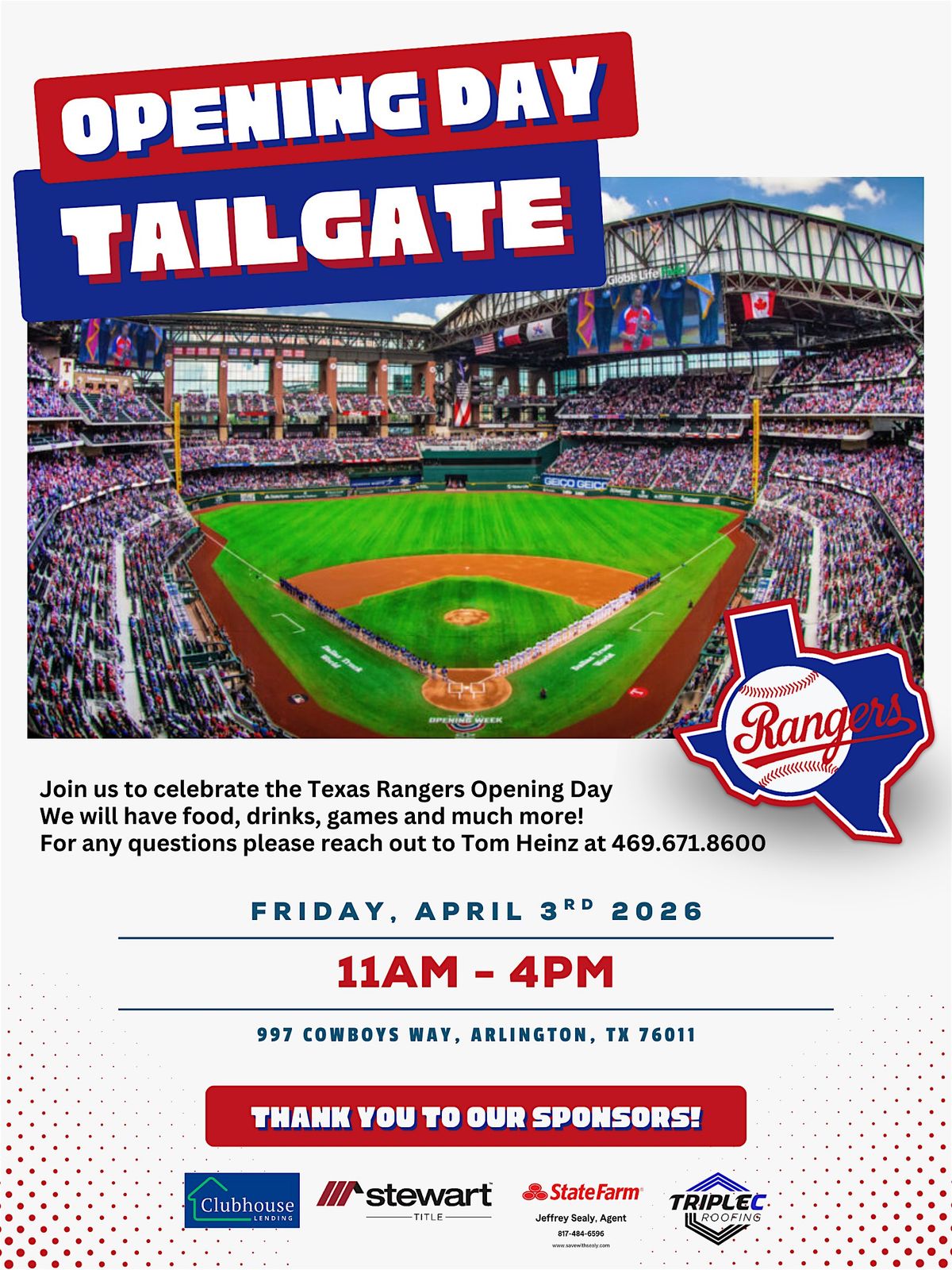 Get ready for some fun at the Rangers Opening Day Tailgate! Join us on April 3, 2026 at 11:00 AM at 997 Cowboys Way. It’s the perfect chance to hang out, enjoy great food, and kick off the season with fellow fans. Don’t miss out on the pre-game excitement and good vibes. See you there!