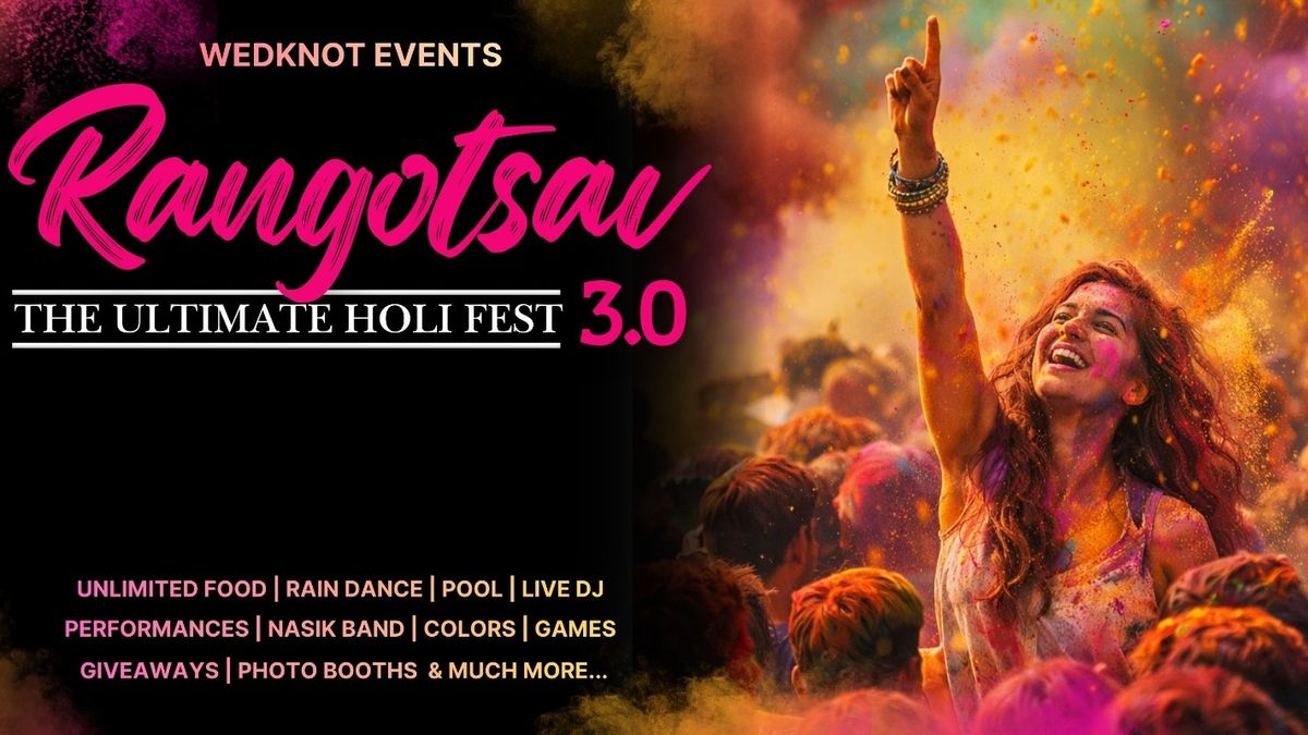 🏵️ Get ready to dive into colours, music & madness at the BEST HOLI EVENT IN GURGAON! 🌈Presenting RANGOTSAV 3.0 – The Ultimate Holi Fest 2026 in Gurugram by Wedknot Events 🥁🎶✨ Why Rangotsav 3.0 is the Most Awaited Holi Festival in Gurgaon 2026:🌈 Unlimited Organic Holi ColoursPlay safe and vibrant Holi with skin-friendly, eco-safe organic colours all day long.🍔 Buffet Breakfast & Lunch Enjoy a delicious buffet breakfast and lunch with a wide variety of tasty options.🏊 Two Swimming Pools (Kids & Adults)Separate swimming pools for kids and adults to relax, splash, and cool off.🌧 Rain Dance ZoneDance your heart out in our high-energy rain dance zone with music and water fun.🎭 Live Stage Performances Witness exciting live stage performances adding nonstop entertainment and festive vibes.🕺 Live DJ & Authentic Nasik Dhol Troop 🥁Groove to a live DJ and feel the energy of authentic Nasik dhol beats.🎢 Adventure Games, Rides & Fun ActivitiesThrilling adventure rides and fun activities for kids and adults throughout the event.🏆 Exciting Giveaways for Kids & AdultsWin exciting prizes and giveaways specially curated for kids and grown-ups alike.📸 Instagrammable Decor & Photo ZonesCapture picture-perfect moments at colorful, Instagram-worthy decor and themed photo zones.🍴 Food Menu Highlights 😋🥞 Breakfast (10:00 AM – 11:30 AM)Mix Veg Pakoras, Cutlets, French Fries, Poha, Aloo Poori & Tea ☕🍛 Lunch (1:30 PM – 3:30 PM)Noodles, Chole Bhature, Veg Biryani, Mix Veg, Dal Makhani, Poori, Raita, Salad, Gulab Jamun & more 🍮🍛Chaat Corner (untill 12 PM)Gol Gappe🥤Beverages(untill 12 PM) Thandai and LemonadeAddons on photobooths:🎇 Smoke Candles, 🎨 Color Shots, 🎩 Funky Hats, 🌈 Colorful Hair Wigs, and so much more to bring extra liveliness and excitement to your Holi celebrations! 🎉🌸💃Games and Activities for Kids and AdultsArchery, Hanging Log, Feed the Joker, Balloon Shooting, Balance Beam, Tire Swing, Rope Bridges, Commando Crawl, Cargo Net, Spider Net, Wall Climb, Tyre Pyramid, Pickle Ball and much more..💥 Colours will fly. Music will roar. Memories will last forever.Don’t miss Gurgaon’s biggest & best Holi celebration 2026 🌈🔥