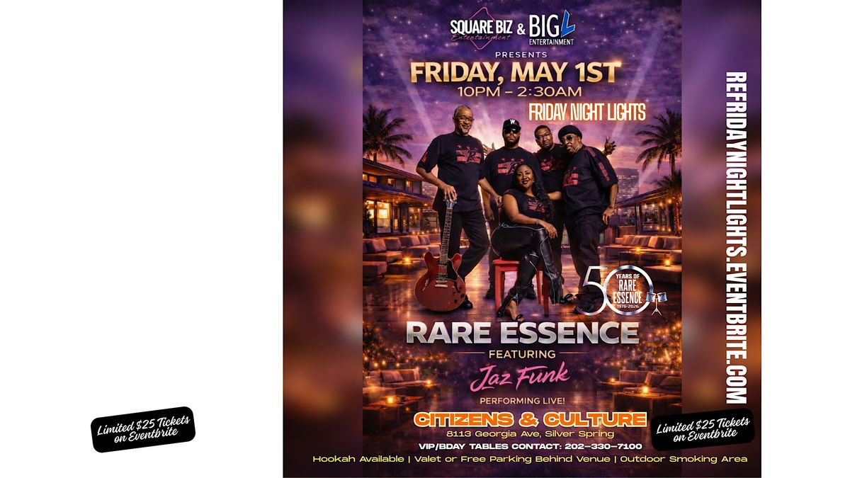 Rare Essence ft Jas Funk performing live! Get ready for a night of music, fun, and good vibes under the stars. Join us on Friday, May 1st , 2025 at Citizens & Culture located on Georgia Avenue in Silver Spring, MD, USA. The event kicks off at 10:00 PM DJ Skip will be spinning all the hits. Bring your friends and let's dance the night away to all the old school hits. See you there!