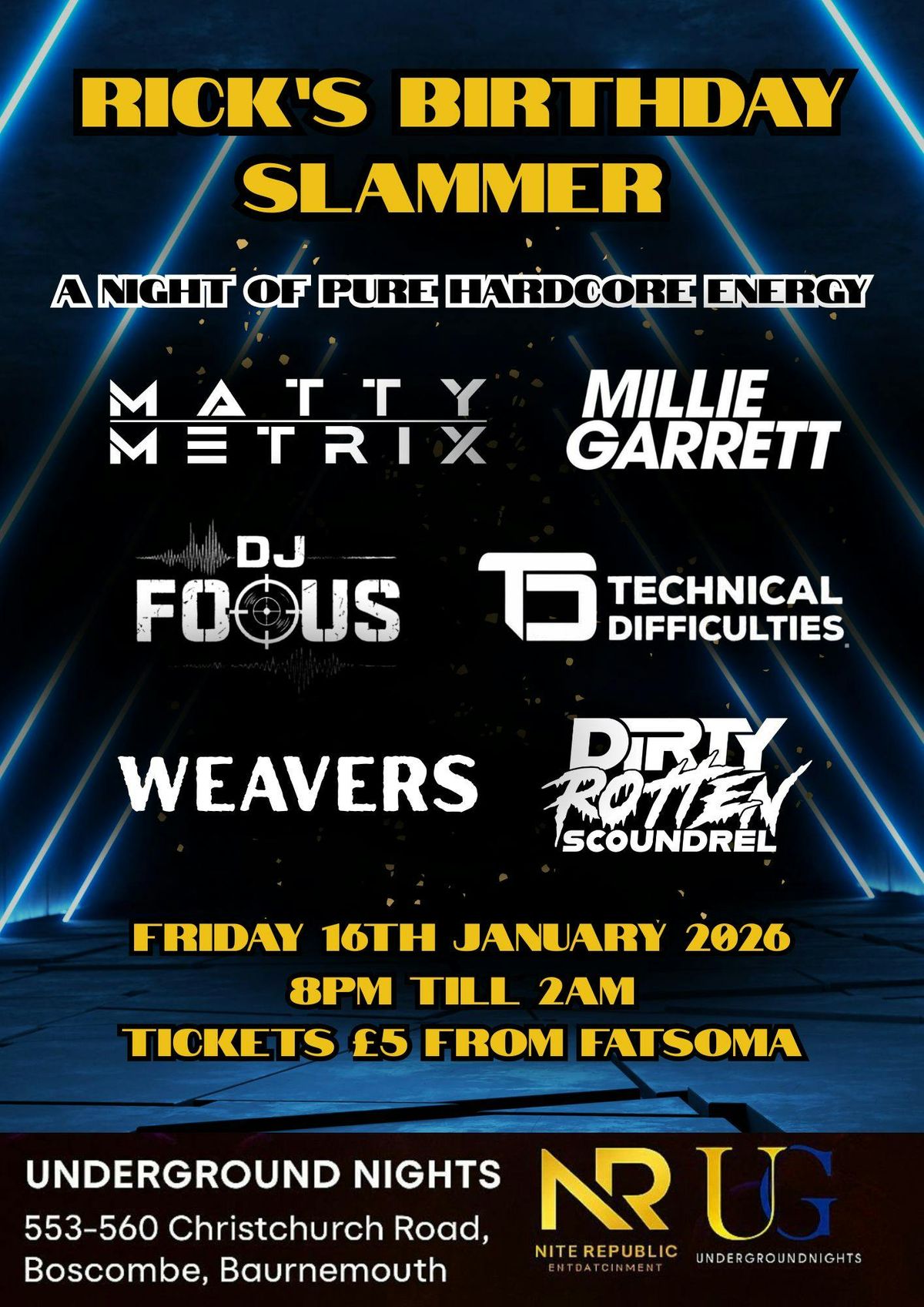 π₯ Rickβs Birthday Slammer β A Night of Pure Hardcore Energy!π Venue: Underground Nights, 553β560 Christchurch Road, Boscombe, Bournemouth