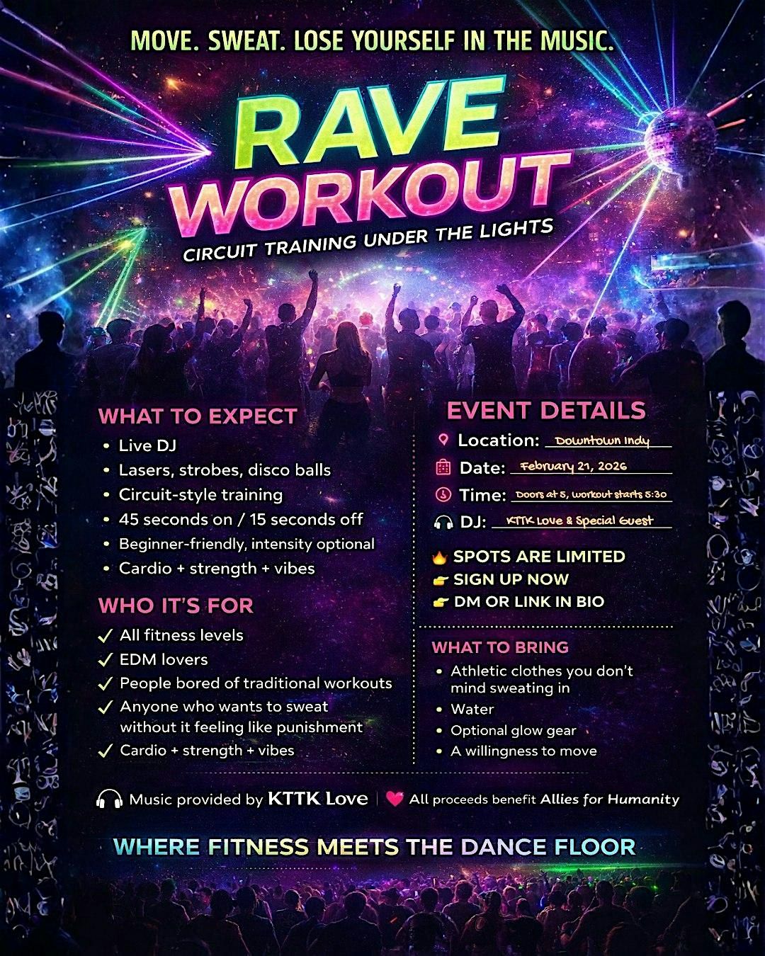 Get ready for something different. This is fitness meets rave — a high-energy circuit workout wrapped in EDM vibes, beats, and disco lights. Move through sweaty, beat-driven circuits as a live DJ drops bass-heavy tracks and boots & cats, while you let the music guide your intensity and flow.