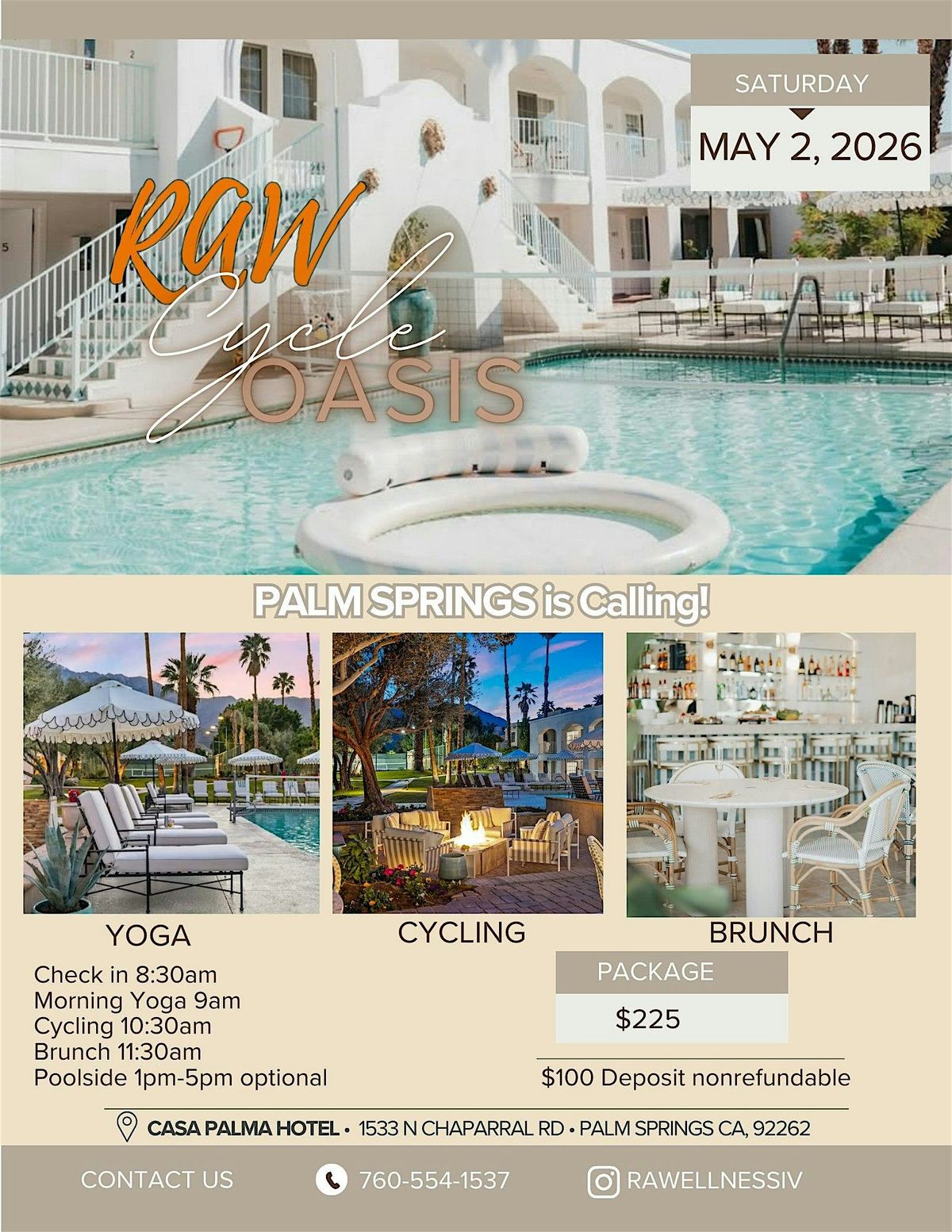 Join us for a day of wellness in the beautiful Casa Palma boutique hotel and enjoy cycling, yoga, brunch, mimosas and poolside fun! RAW Cycling Studio is brining in stationary bikes to do a 45 min cycle session out in the garden area. We will also have morning yoga to balance our day. The day retreat includes Brunch at the hotel restaurant, and a mimosa, coffee or juice is included! After enjoy time poolside (optional) to hangout and relax.