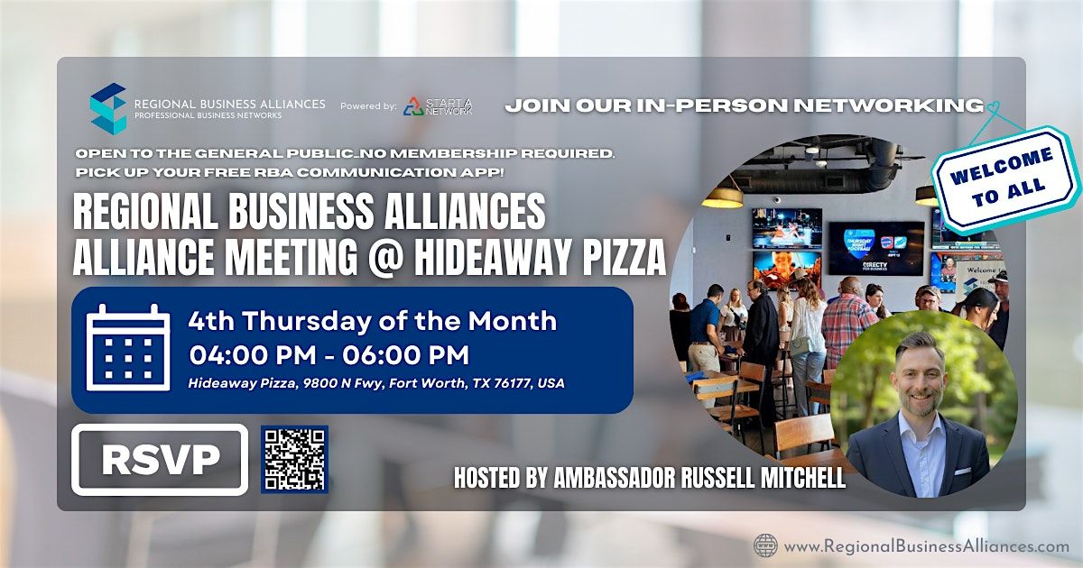 Join the RBA Alliance community for our monthly networking event at Hideaway Pizza, which is cutrently being hosted by Ambassador Russell Mitchell!