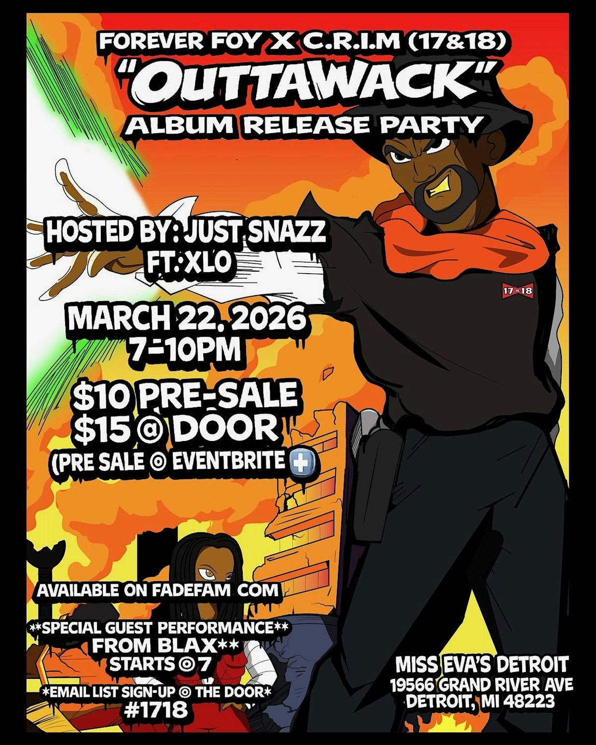 Come hang out at Miss Eva's Detroit for a night of fresh beats and good vibes! We're celebrating the release of the 17&18 OuttaWack album with special guest BLAX. Don't miss out on the fun happening on March 22, 2026 at 8:00 PM (Eastern Time). Bring your crew and get ready for an unforgettable night!