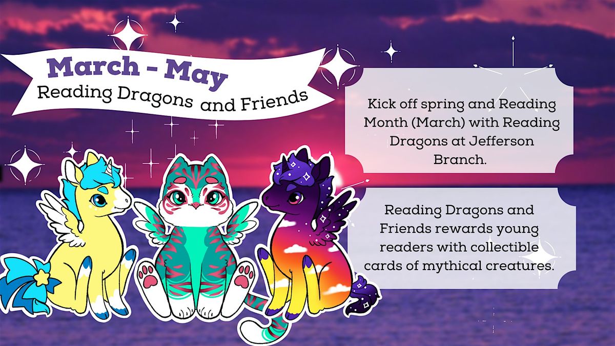 Celebrate the beginning of Spring, and Reading Month at Jefferson Branch with Reading Dragons! Earn collectible playing cards for the reading you are already doing. Each card features a different mythical creature, and can be used to play against each other and staff members at Jefferson. Started at the Dover Public Library in Dover Ohio, Reading Dragon cards are earned through reading. Stop at the circulation desk to sign up, and collect your dragons. At sign up you will receive a starter set of dragons, a rules card, a reading tracker, an egg checklist, and a collector's card box.