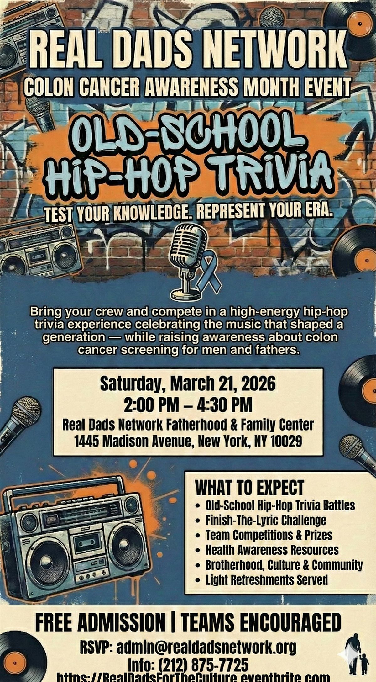 Bring your crew and compete in a high-energy hip-hop trivia experience celebrating the music that shaped a generation — while raising awareness about colon cancer screening for men and fathers.