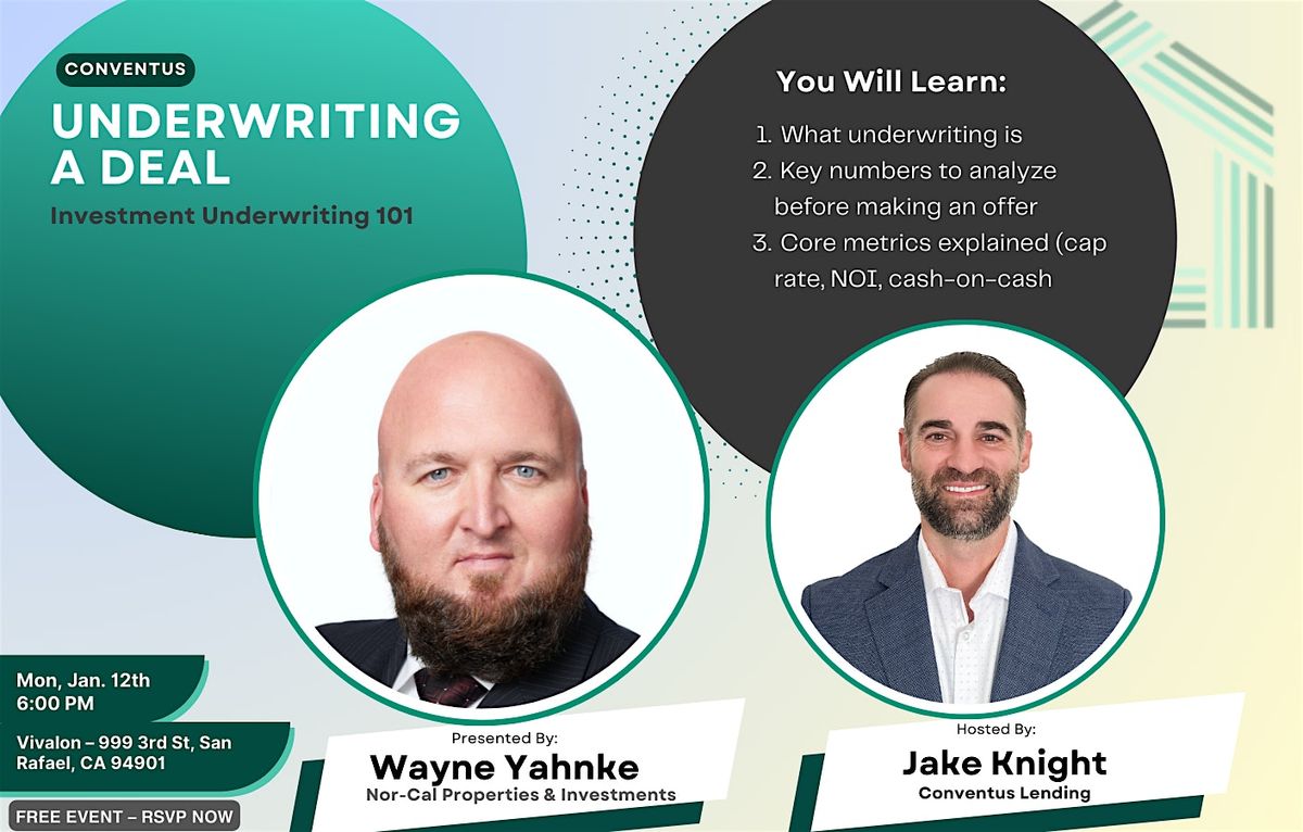 Whether you are a seasoned pro or just getting started, the success of your investment is determined before you ever sign the closing papers. Join us for a special session with Wayne Yahnke of Nor-Cal Properties & Investments as we pull back the curtain on professional real estate underwriting.