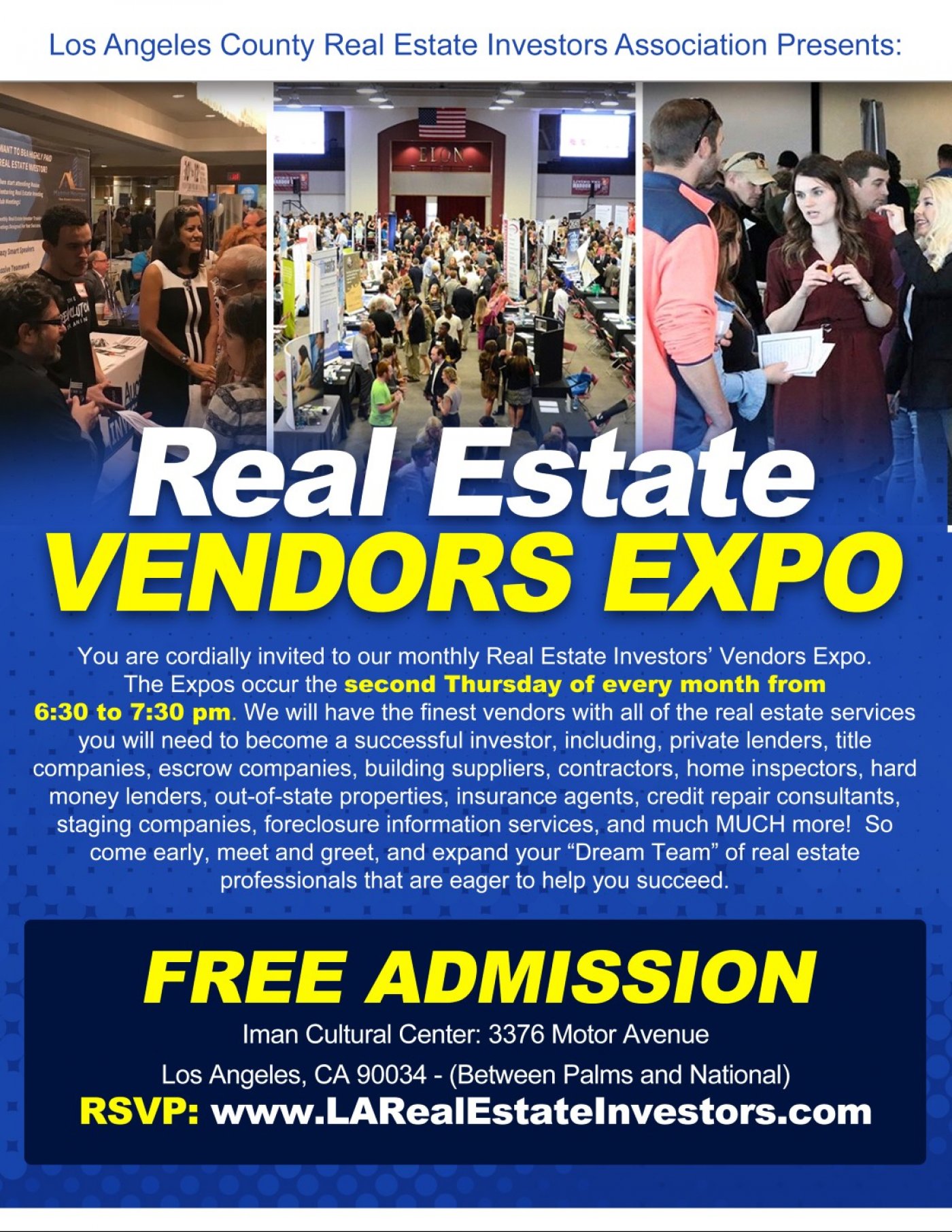 Vendors Expo. Our super-duper, world-famous "Real Estate Vendors Expo," returns on Thursday night, February 12, 2026, at the Los Angeles County Real Estate Investors Association. The Vendor Expo opens promptly at 6:30 pm. Don't be late!
