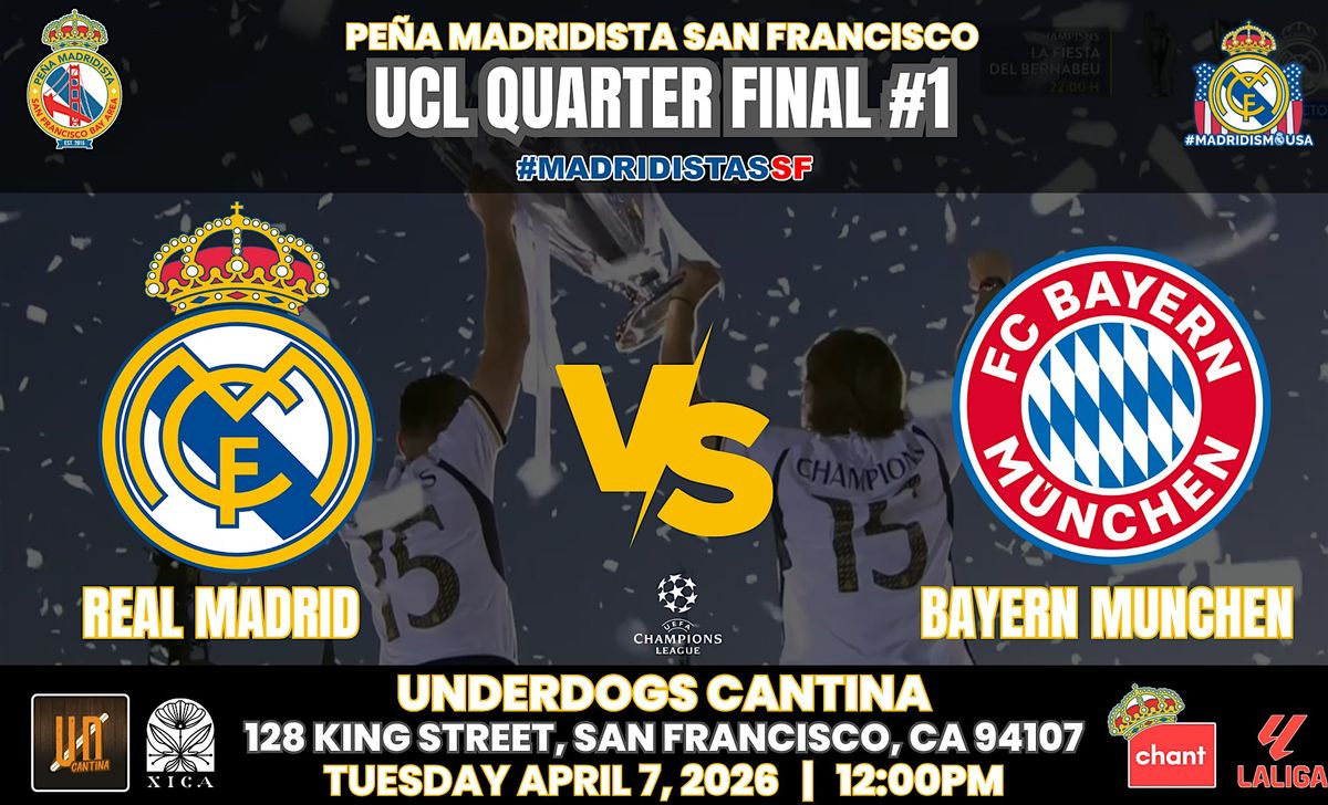 Peña Madridista San Francisco & Golden Road Brewing proudly invite you to join us at Underdogs Cantina to watch the UCL match between REAL MADRID vs BAYERN MUNICH.