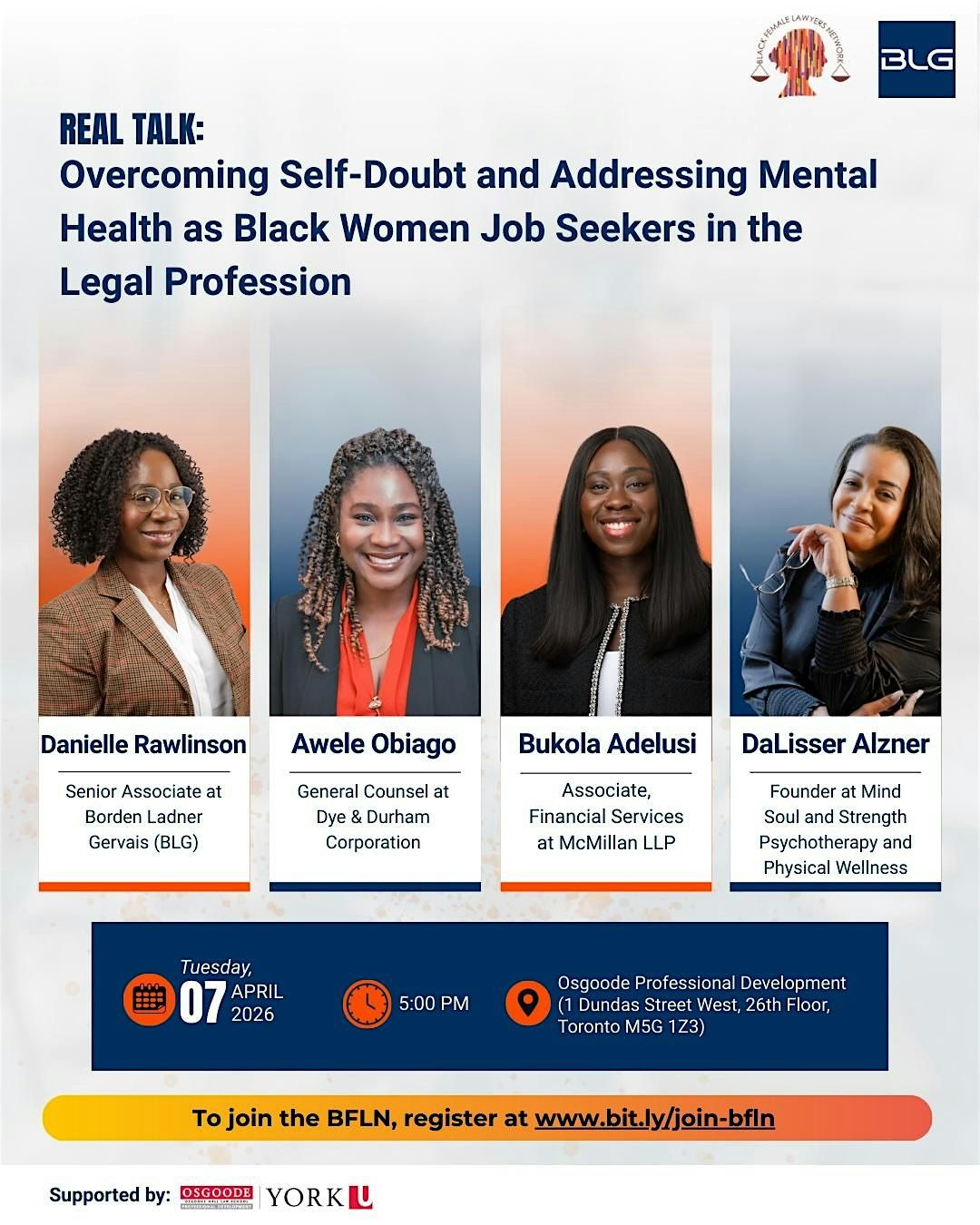 There will be an incredible panel session with Danielle Rawlinson, Awele Obiago, Bukola Adelusi and DaLissa Alzner, followed by a Question and Answer session. The event will close out with a wellness activity!