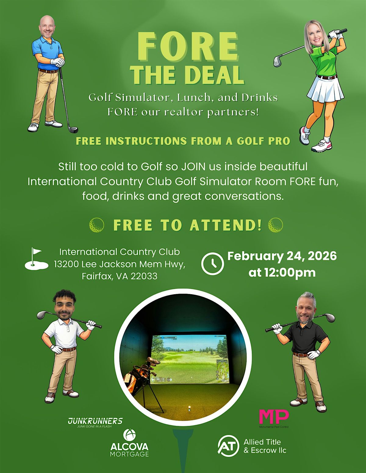 It's too cold to golf outside... But that shouldn't hold us back from hitting some balls with a PRO! Join us in the Golf Simulator Room at International Country Club where we will provide the simulator room, free instrutions from a pro, and food and drinks! Bring your clubs, but if you don't have them...no worries! Golf experience NOT required. The more the merrier - come join us for fun & networking!