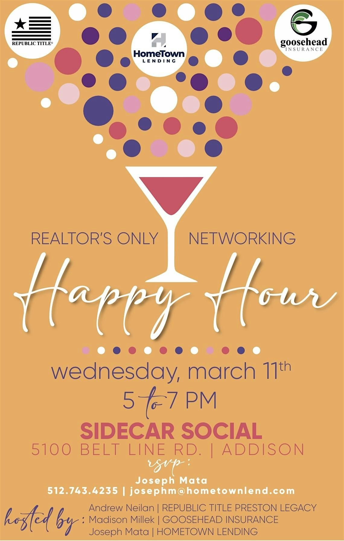 Join us for a fun-filled evening at the Realtor Happy Hour! This is your chance to connect with fellow real estate pros, swap stories,and unwind after a busy day. Enjoy great vibes, good company, and maybe even a few surprises.Dont miss out on this in-person just for realtors like you See you there!