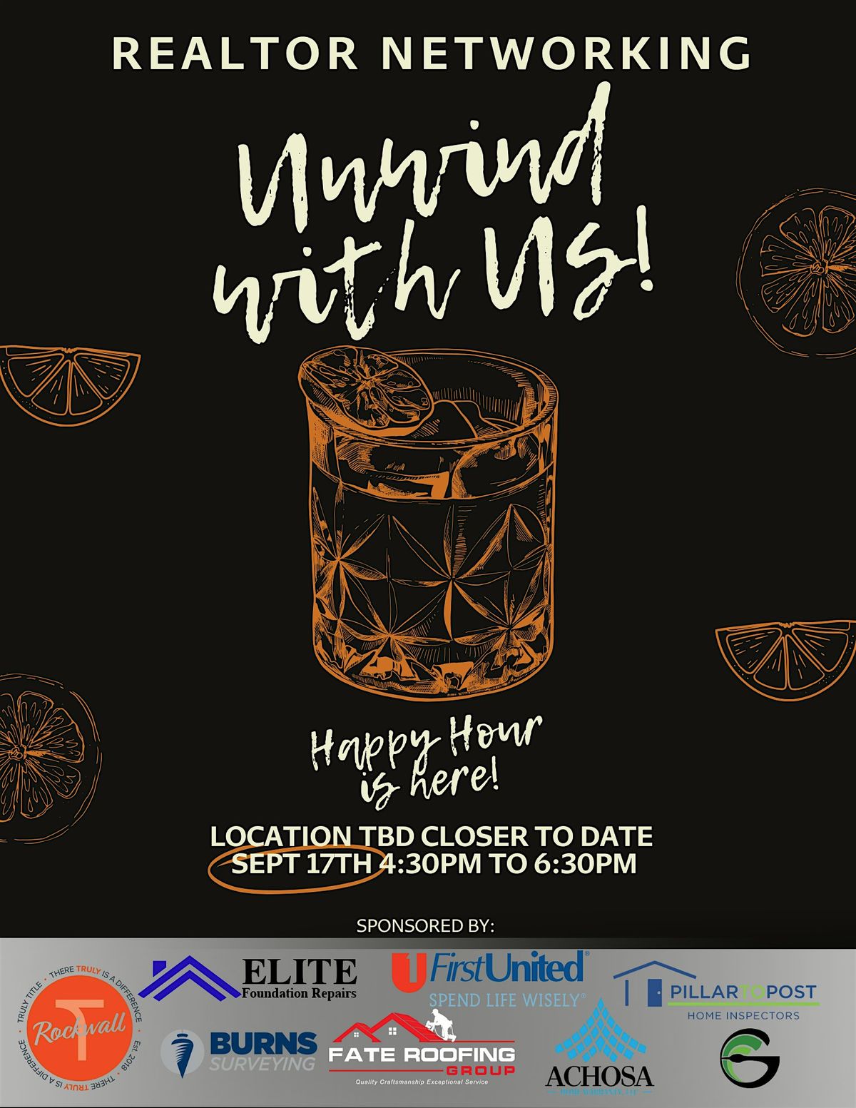 Calling all Realtors! Join us for our September Happy Hour. **NOTE: Location TBD closer to date.** Location May Change.
