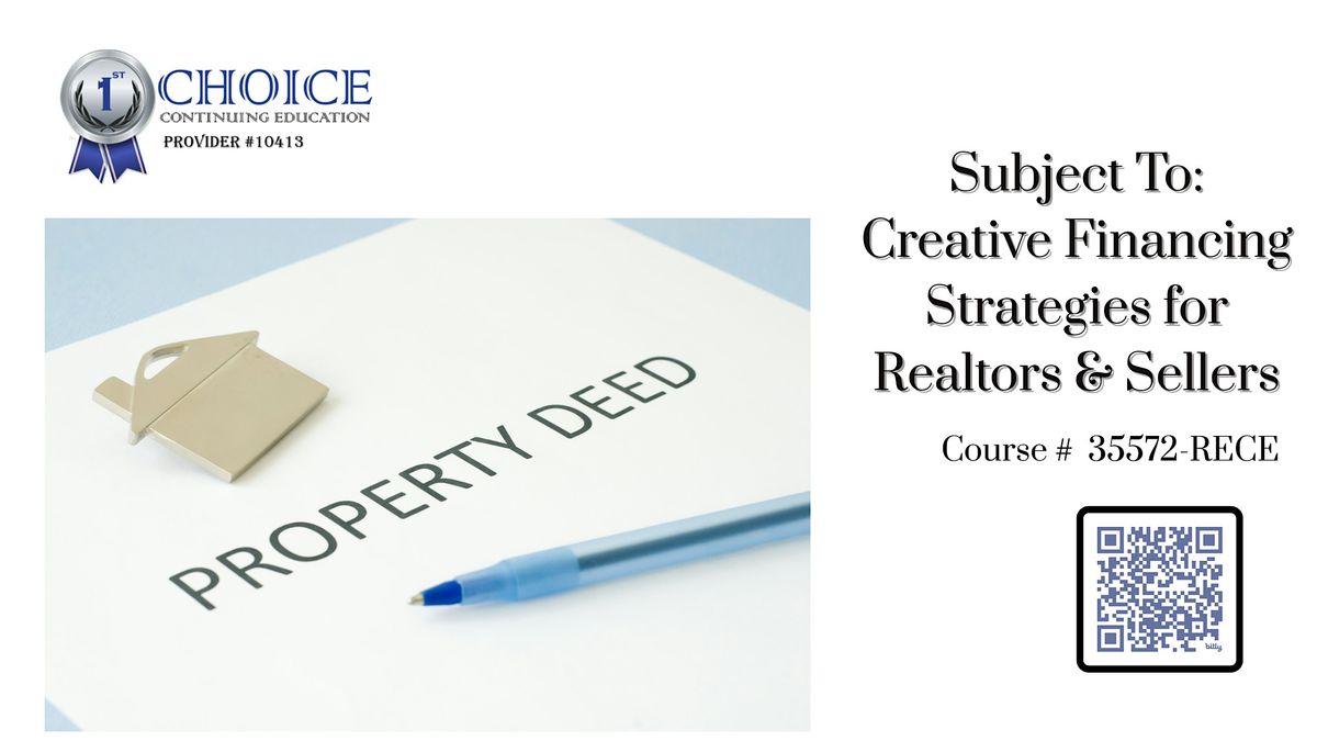 Realtors FREE CE In Person CE-Suject To Creative Fin For Realtors & Sellers. Join us in person for an awesome session tailored just for realtors to help your sellers! Dive into the world of creative financing and boost your skills with this FREE CE event. Don’t miss out on this chance to learn, network, and grow your real estate game. See you there!