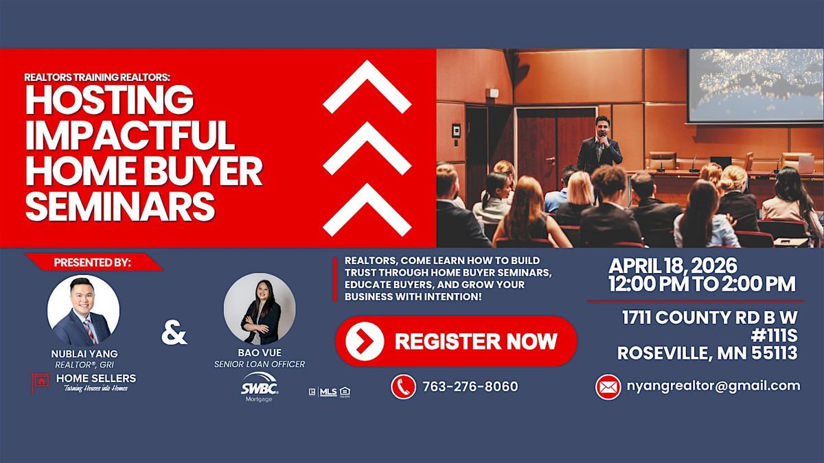 Join Nublai Yang, Realtor® (GRI) with Home Sellers, and Bao Vue, Senior Loan Officer with SWBC Mortgage, for an engaging in-person workshop on hosting successful homebuyer seminars.