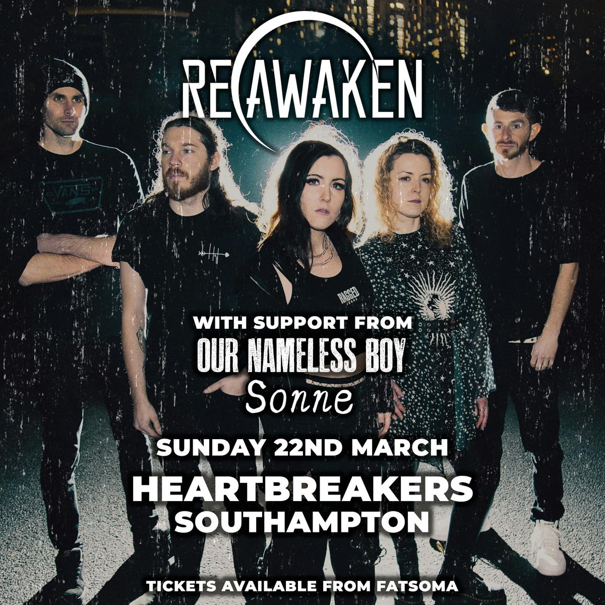 A night of alt rock at Heartbreakers!ReawakenHard hitting, Female Fronted band from Southampton. Able to capture the attention of any audience with their harmonious eerie tones and bewitching stage presence. For fans of Halestorm, Flyleaf, Alter Bridge and The Pretty RecklessOur Nameless Boy