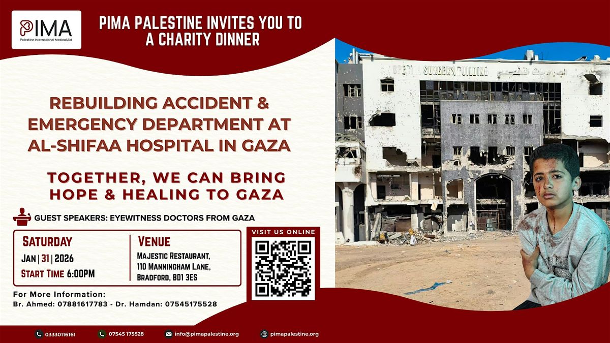 Join us for a powerful and inspiring evening dedicated to supporting lifesaving medical projects in Gaza. This charity dinner, organised by PIMA – Palestine International Medical Aid, brings our community together to stand with the wounded, the displaced, and the medical teams working under unimaginable conditions.
