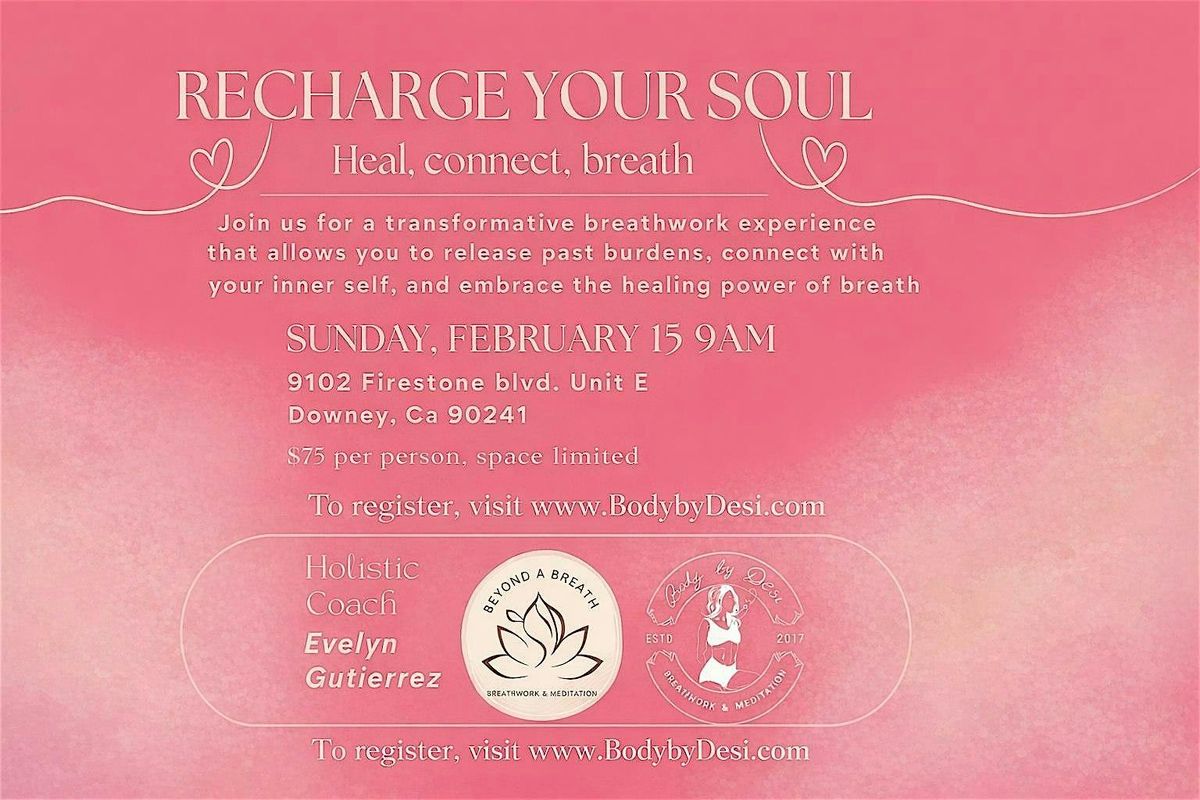 Join us for “Recharge Your Soul,” a unique breathwork experience designed to help you heal, connect, and breathe deeply. This transformative session will guide you in releasing past burdens and connecting with your inner self, allowing you to embrace the healing power of breath.