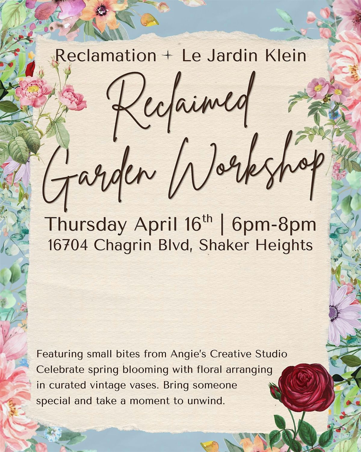 Audrey of Le Jardin Klein will guide you through her signature approach to floral design, blending intuition with technique, so your arrangement feels both natural and elevated.