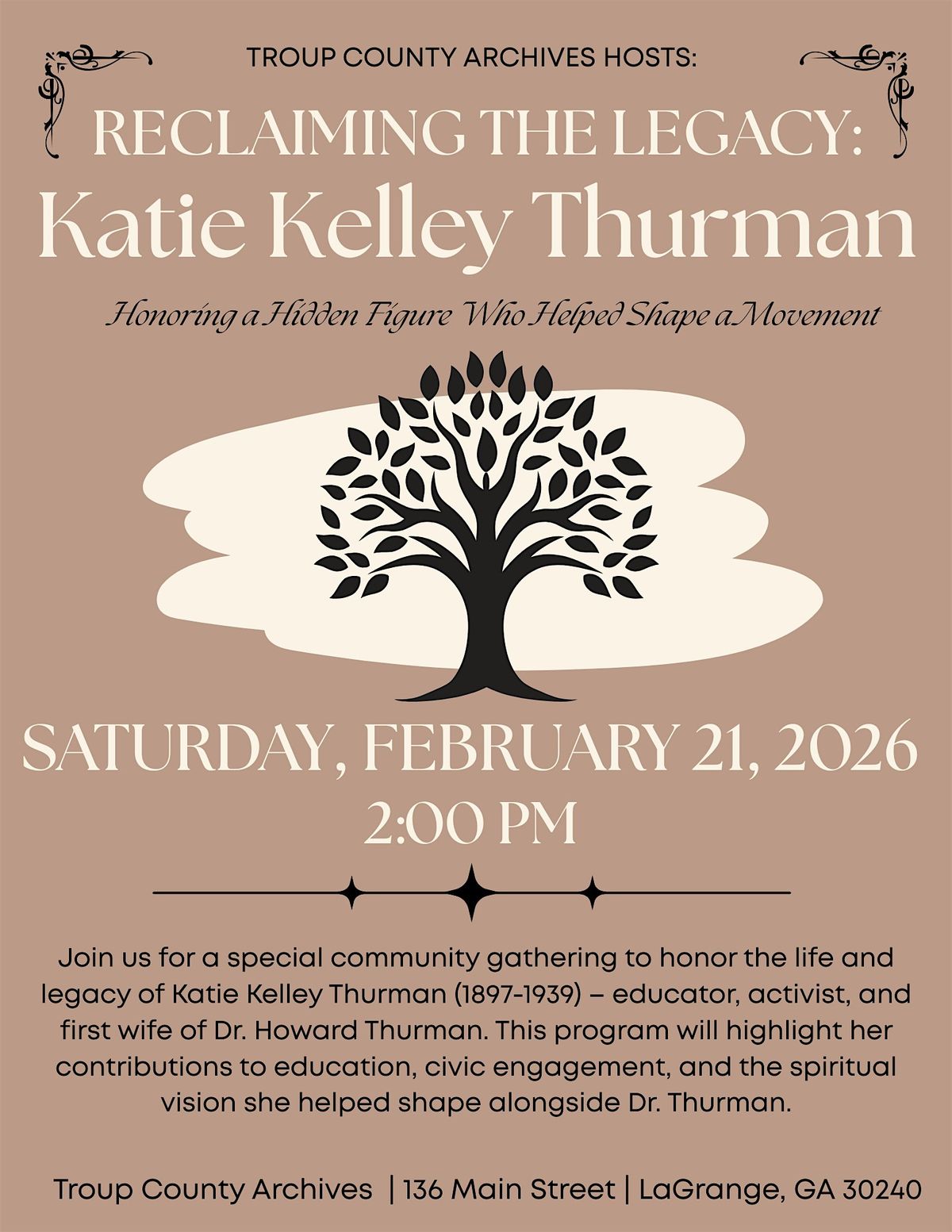 Join us for a special community gathering honoring the life and legacy of Katie Kelley Thurman (1897–1939), educator, activist, and the first wife of Dr. Howard Thurman. This free program will explore her lasting contributions to education, civic engagement, and the spiritual vision she helped shape alongside Dr. Thurman. The event will feature virtual guest speakers sharing insights into her remarkable impact. Light refreshments provided.