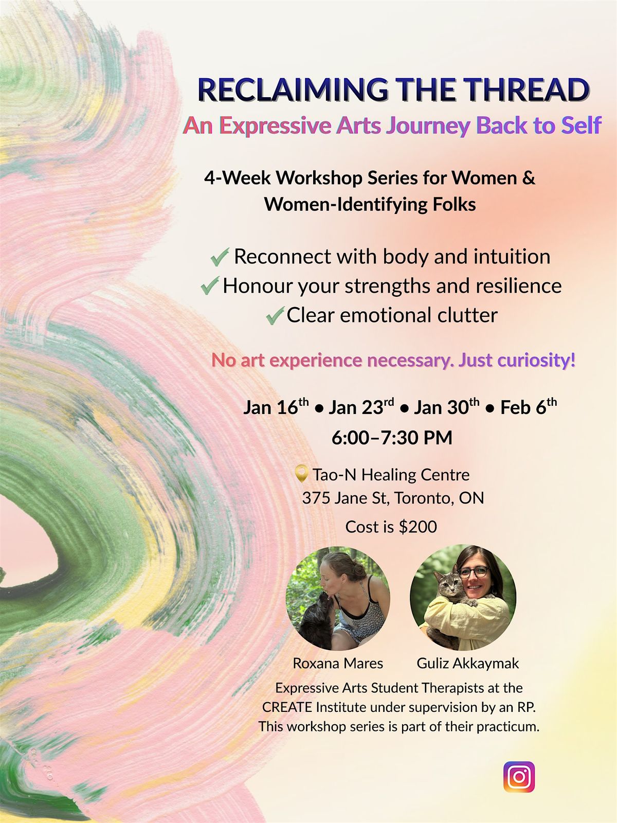 Roxana Mares & Guliz Akkaymak, Expressive Arts Student Therapists at the CREATE Institute under supervision by a Registered Psychotherapist. This workshop series is part of their practicum.