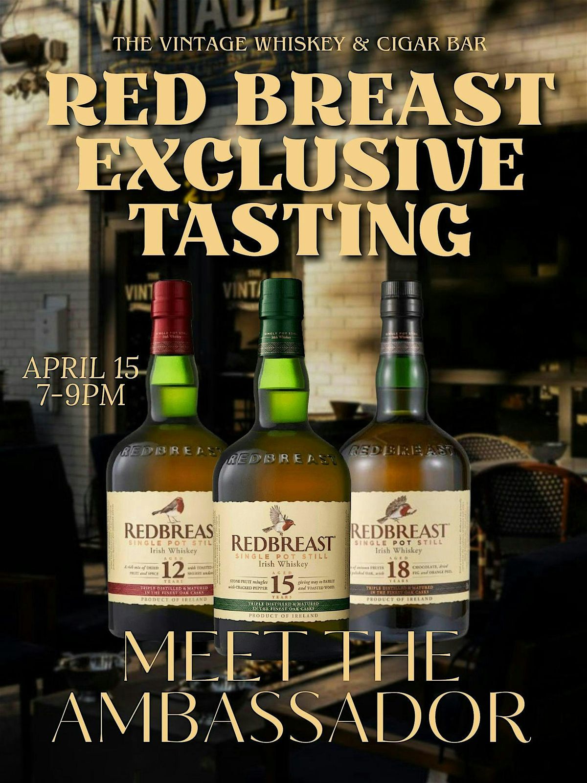 Welcome drink included! Enjoy an exclusive tasting of Redbreast 12, 15, and 18! Meet the brand ambassador and experience a luxury event!