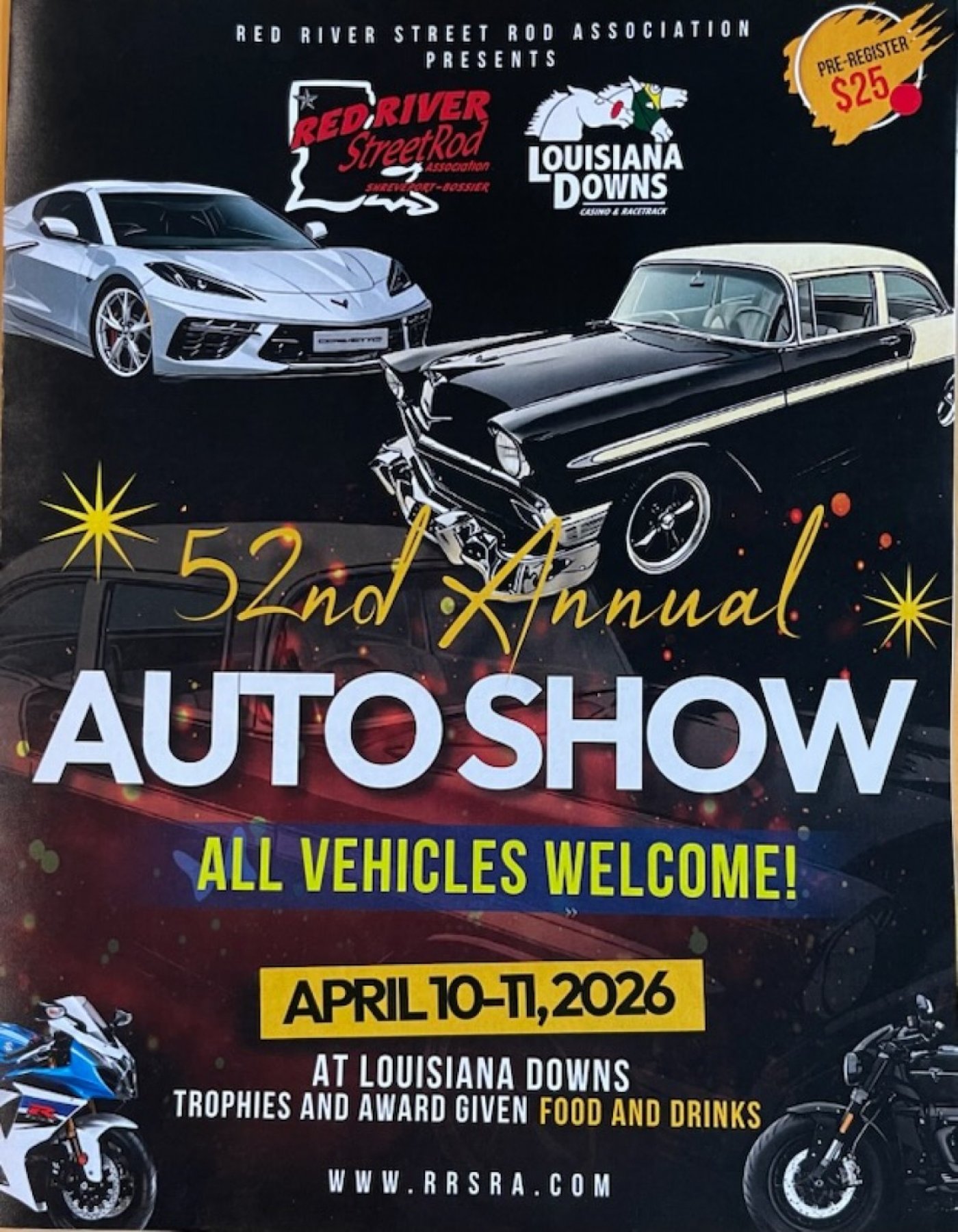 RRSRA 52nd Annual Open Auto Show (cars, trucks, motorcycles) with proceeds donated to Shreveport/Bossier Rescue Mission & Shriners Children's Hospital in Shreveport, LA.