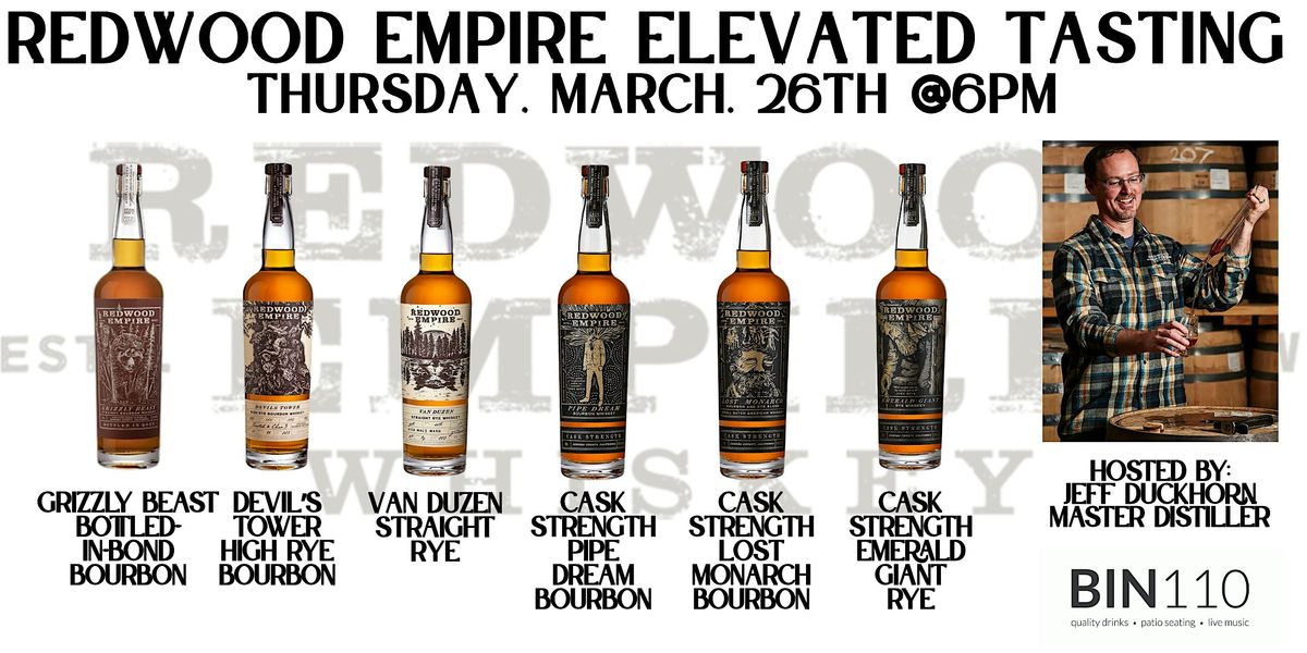 Join us at Bin 110 for an exclusive Redwood Empire Elevated Tasting featuring Master Distiller Jeff Duckhorn in person.