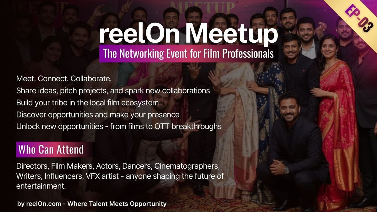 reelOn Meetup – Networking Event for Film ProfessionalsreelOn Meetup is a curated networking experience designed for people working in and aspiring to work in the film and entertainment industry. This meetup brings together creative professionals from different disciplines to connect, collaborate, and exchange ideas in a focused and welcoming environment.The event encourages meaningful conversations around films, OTT content, short films, and digital storytelling. Participants get the opportunity to interact with fellow creators, discuss ongoing and upcoming projects, and explore potential collaborations that can lead to real-world opportunities.Whether you are looking to expand your professional network, pitch an idea, find collaborators, or simply learn from the experiences of others in the industry, reelOn Meetup offers a platform to engage with the local film ecosystem in a practical and approachable way.What You’ll ExperienceNetworking with film and media professionalsCreative discussions and idea exchangesOpportunities to pitch concepts and explore collaborationsExposure to diverse perspectives across films and OTT contentCommunity building with like-minded creatorsWho Should AttendDirectors, filmmakers, actors, dancers, writers, cinematographers, editors, influencers, VFX artists, and anyone passionate about shaping the future of entertainment.