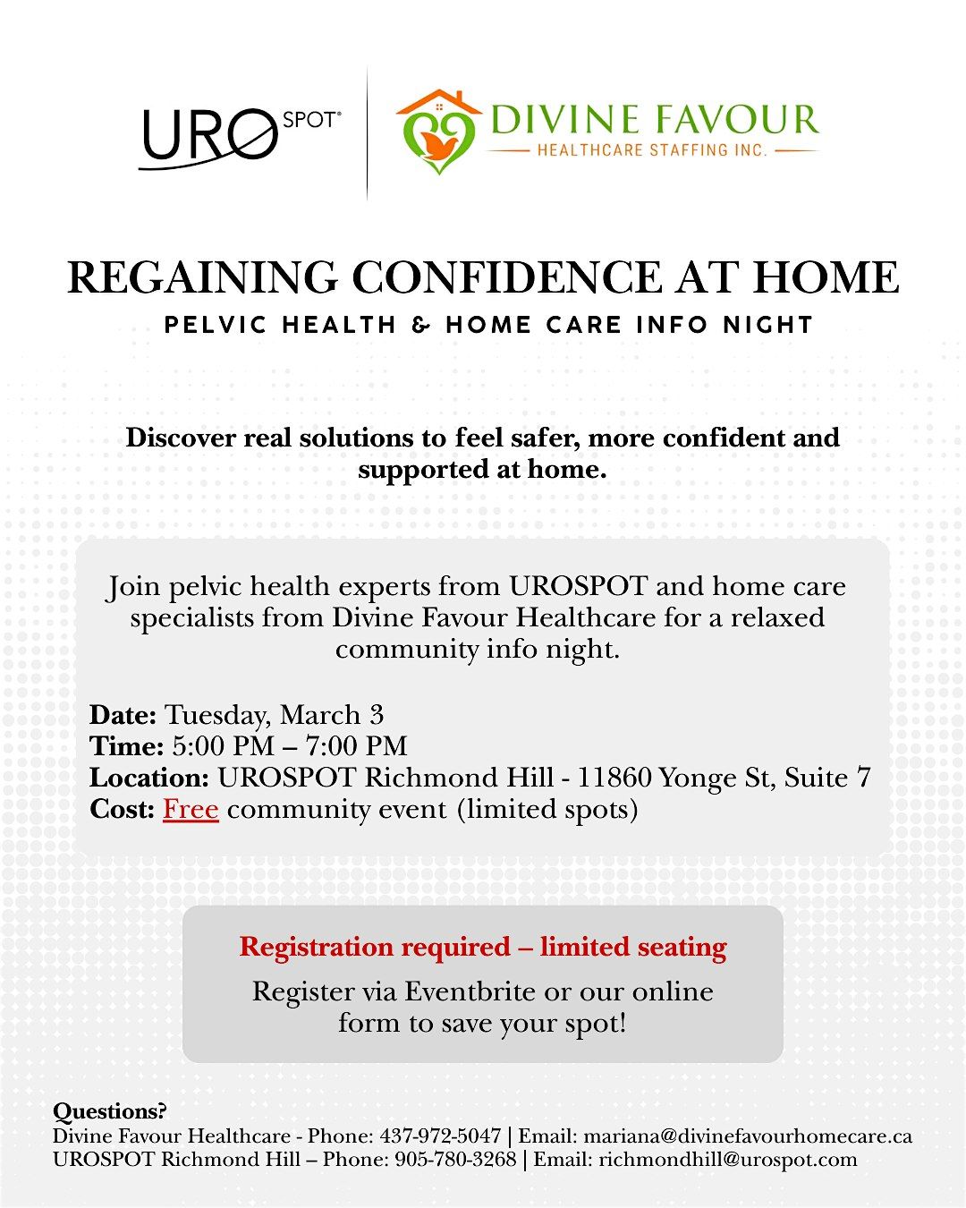 Join UROSPOT Richmond Hill and Divine Favour Healthcare Staffing for a relaxed, judgment-free Community Info Night that brings pelvic health experts and home care specialists together in one room. We will talk openly about leaks, urgency, falls and caregiving, and share real options to help you or your loved one feel safer and more confident at home.
