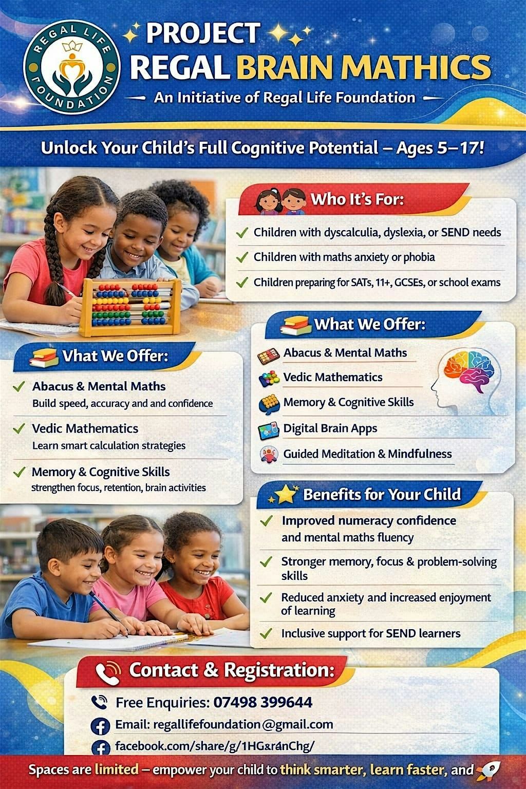 Get ready to boost your brainpower with our fun and interactive in-person sessions! Join the REGAL BRAINMATICS classes to sharpen your mind, learn cool math tricks, and connect with others face-to-face.? Our Programs & Support Areas Include: