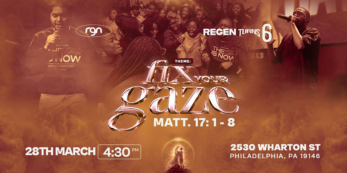 Join us as we celebrate REGEN Revivalist’s 6th Anniversary. The theme for this year’s event is taken from Matthew 17:1–8, titled “Fix Your Gaze.” In this new season, the Lord is calling us to fix our gaze solely on Him. In a world filled with distractions and confusion, God wants to do something in us, through us, and shape us to reflect Him. This is the time to fix our gaze on Jesus.