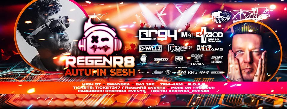 Well, It's time to gather the RegenR8 troops for our Autumn Sesh, This time we're bringing the big names to our favourite venue...Hippos. we're taking over the whole venue on this one, giving you 2 rooms and 18 DJs?There's a stinking line up for this one with the talented Argy UK joining us for the first time and back by popular demand we have the one and only Matt OD(Organ Donors) Matt played one hell of a set for the spring Sesh so we had to have him back for the Autumn Sesh.