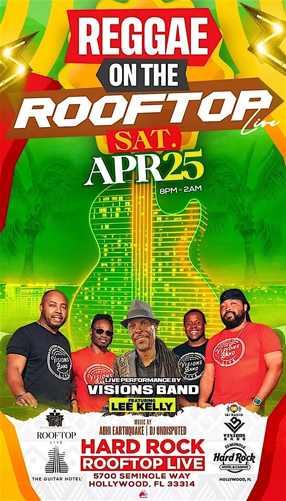 Live reggae on Hardrock Rooftop with Visions Band . Reggae , Soca Dancehall and more ..LIVE !April 25rh 8-2am . RSVP HERE