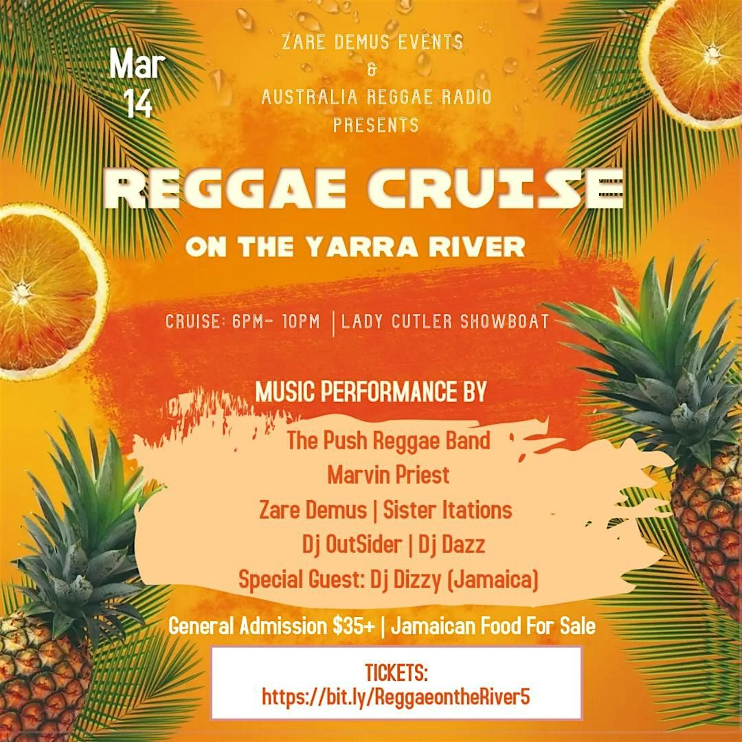 Reggae on the River is the ultimate Reggae Cruise. Hosted on the iconic boat, the Lady Cutler, this cruise brings nothing but good vibes. Bannered under the idea of Bob Marley's Reggae anthem 'One Love" this cruise welcomes everyone. Music on both levels of the boat gives us a 4 hour cruise packed with entertainment. Relax sailing with the amazing SUNSET and trip from Docklands to Williamstown, Port Melbourne and St. Kilda Beach.