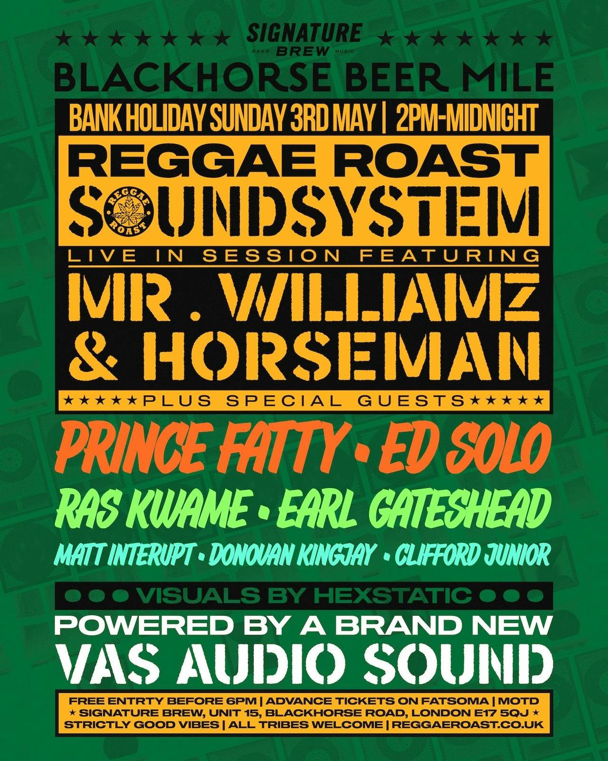 Reggae Roast bring their full heavyweight Soundsystem to Signature Brew, Walthamstow for a massive indoor & outdoor Bank Holiday session.Â
