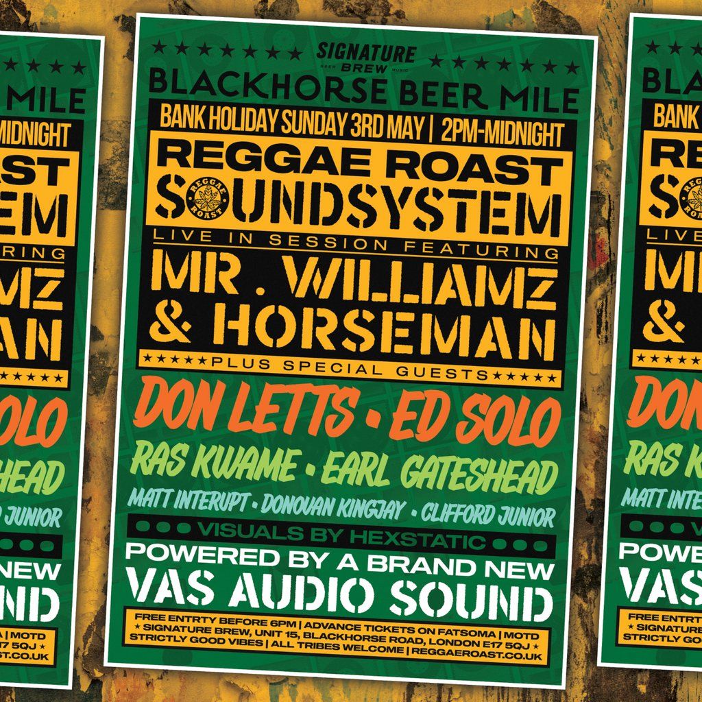 Reggae Roast Soundsystem Bank Holiday party at Signature Brew, London. Outdoor courtyard session by day, reggae, dancehall & jungle inside at night.Artists