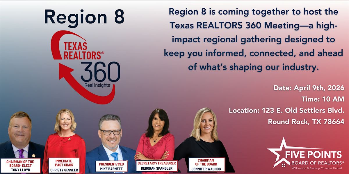 Region 8 is coming together to host the Texas REALTORS 360 Meeting—a high-impact regional gathering designed to keep you informed, connected, and ahead of what’s shaping our industry.