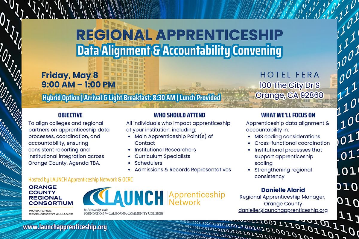 Join us in person for the Apprenticeship Data Alignment & Accountability Convening, where regional teams come together to align colleges and regional partners on apprenticeship data processes, coordination, and accountability, ensuring consistent reporting and institutional integration across Orange County. Hybrid options are available and breakfast and lunch provided; see agenda for details.