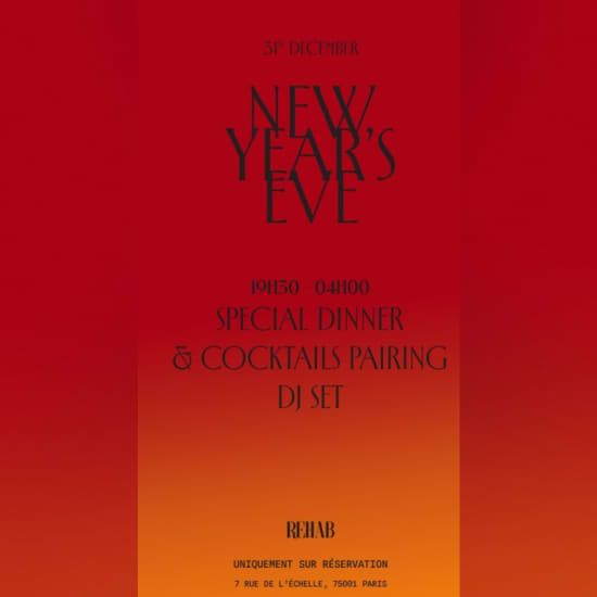 Billets pour Rehab Nouvel An à Paris, France 🎫 Menu + accords mets et cocktails Informations générales 📅 Dates : Choisissez vos dates directement dans le sélecteur de billets 🕒 Horaires : 19h00 - 4h00 📍 Adresse : 7 rue de l'échelle Description Menu Accord mets et cocktails Un cocktail par plat (3+1 mini pour les amuses bouches) Chaque cocktail est pensé et adapté au menu afin d'être complémentaire au met servi ! Trio d'Amuses Bouche : Thon rouge, ponzu tagette Poulet frit, crème fraiche et ail noir Tartelette au vacherin et Mont d’or Entrée : Coquille Saint Jacques, beurre a la truffe, panais en deux textures et brunoise de pommes granny Option veggie : Cèpe, beurre a la truffe, panais en deux textures et brunoise de pommes granny Plat : Dos de cerf, râgu aux cerf, sirop de sapin, dattes glacées et potimarron Option Veggie : Choux pointu, sirop de sapin, dattes glacées et potimarron Dessert : Dacquoise noisettes torréfiées, chocolat au lait caramel, glace à la noisette Merci de communiquer toute allérgie/intolérance lors de votre réservation. DJ set à partir de 22h