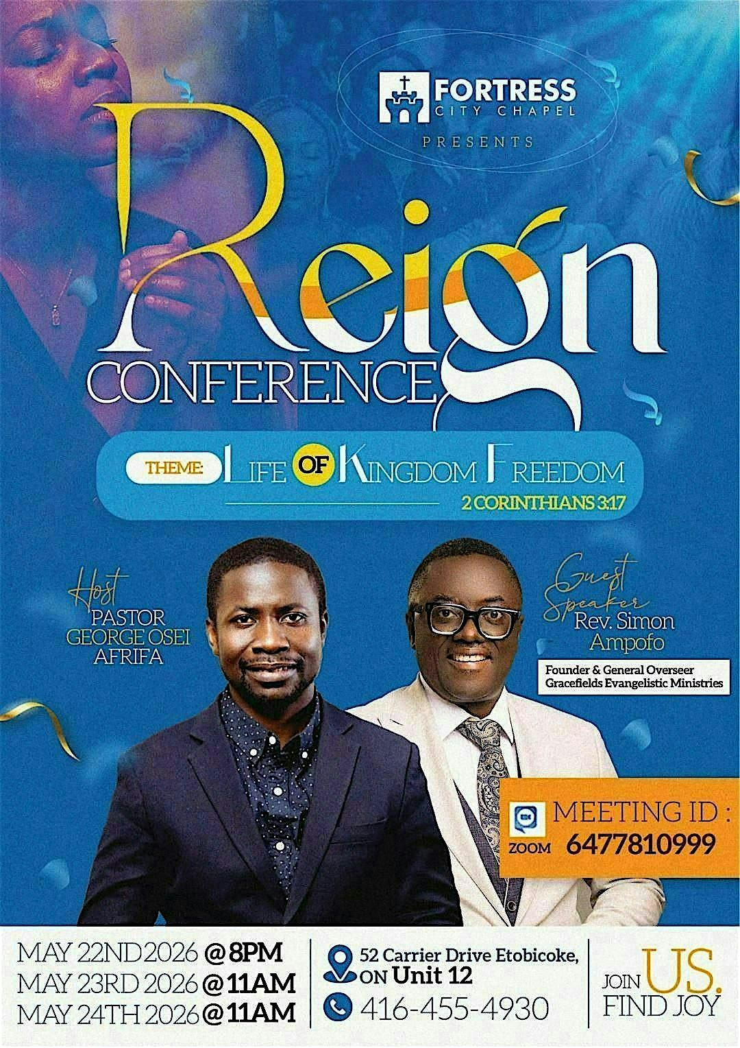 Under the theme “Life of Kingdom Freedom” (2 Corinthians 3:17), attendees will be equipped to live boldly, break limitations, and step into a higher level of purpose and authority. Expect impactful sessions led by Host Pastor George Osei Afriyie and Guest Speaker Rev. Simon Ampofo, Founder and General Overseer of Gracefields Evangelistic Ministries.