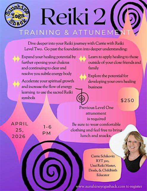 The workshop will include in-person training, hands-on practice, Reiki Level 2 attunement and certificate.