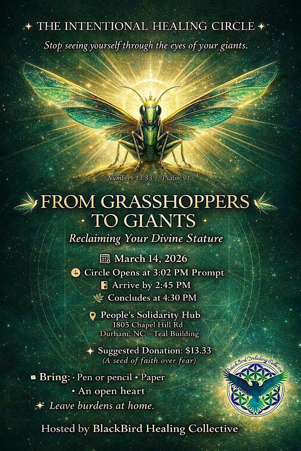 #IntentionalHealingCircle #BlackBirdHealing #DurhamNCEvents #ReikiCircle #FaithOverFear #GrasshopperToGiant