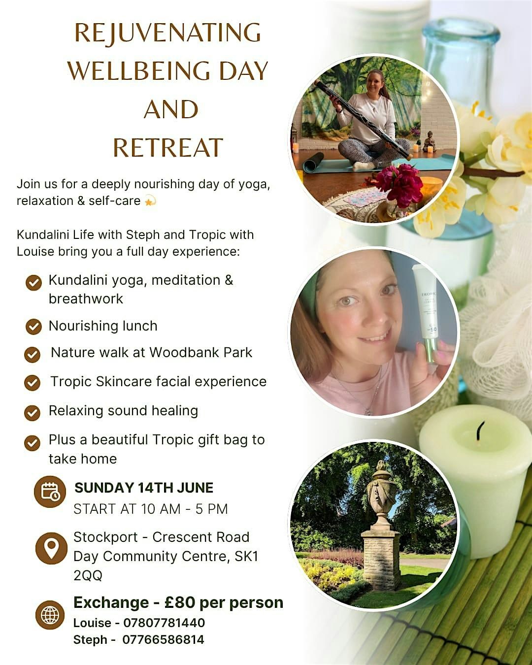 Enjoy a full day filled with refreshing activities, skincare tips, and positive vibes brought to you by Kundalini Life with Steph and Tropic with Louise. It’s all about feeling great inside and out – don’t miss out on this awesome chance to treat yourself!