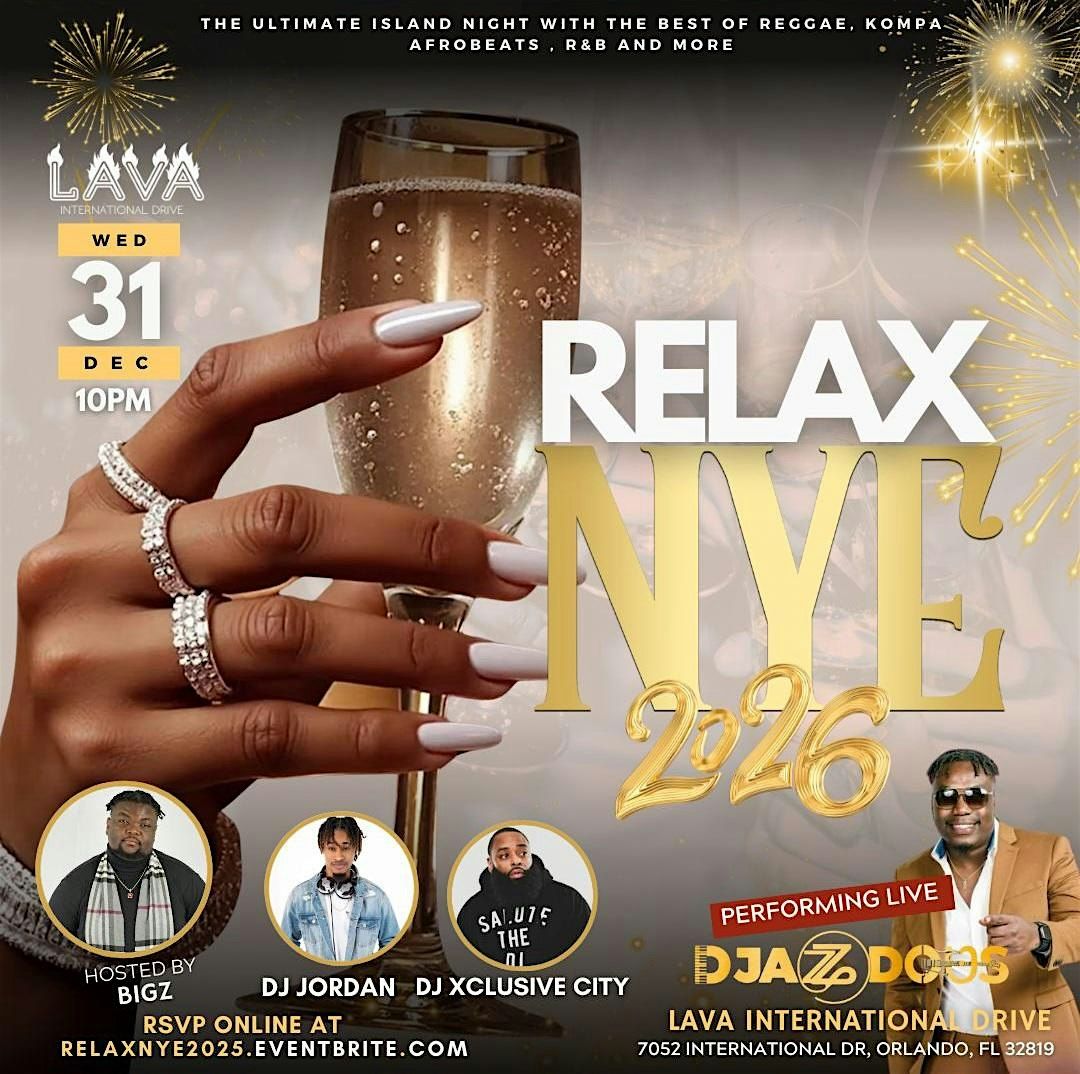 Welcome to the RELAX NYE CELEBRATION!!! happening at Lava International Drive on December 31, 2025 at 9:30 PM. Get ready to ring in the New Year in style! Join us for a night of LIVE music from DJAZZDOUS, dancing, and unforgettable memories. Don't miss out on this epic celebration!