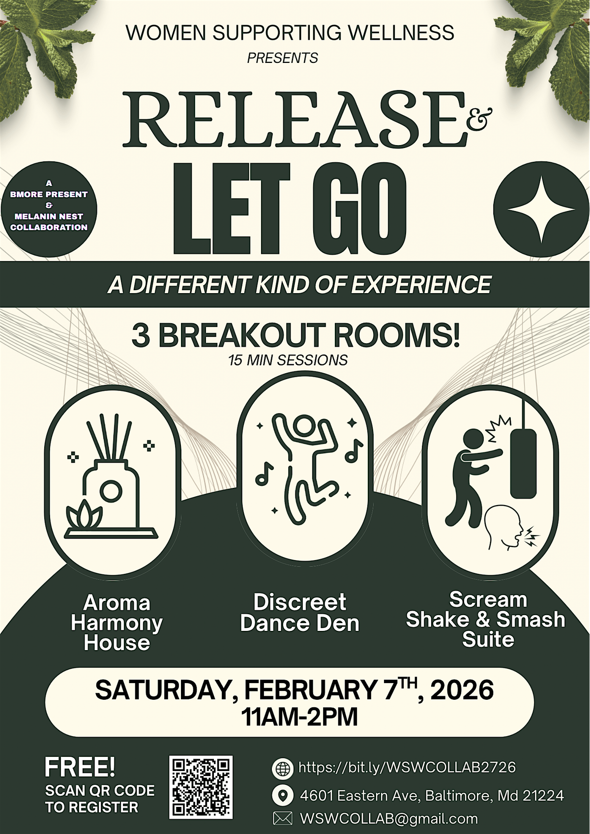 An elevated wellness and healing experience offering three interactive breakout rooms: sound bath and aromatherapy, vibration plates with stress-release tools like scream pillows and punching bags, and a silent dance experience.