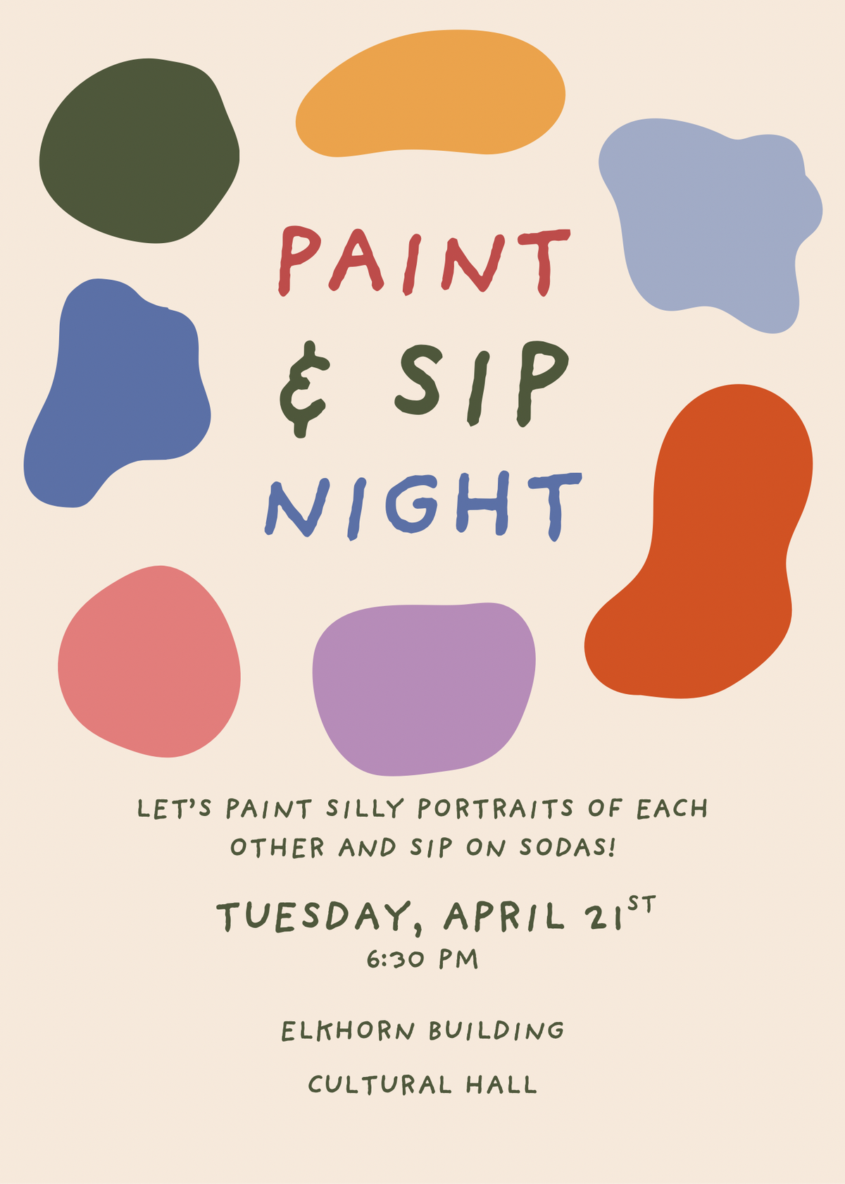 Our April activity is a paint and sip night and it's coming up on Tuesday, April 21st at 6:30pm. We're going to spend some time trying to paint a portrait of the person across from us, and we'll all reveal our work at the same time. It's going to be hilarious and fun and we'd love for you to come! We'll have a soda bar to sip on while we paint and chat. We'll meet in the cultural hall at the Elkhorn Building. Hope you can make it!