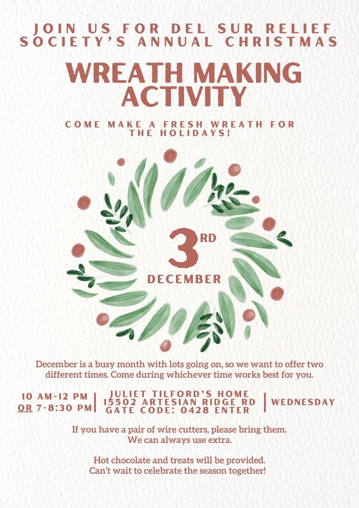 Come join us for our annual wreath making activity on December 3 and leave with fresh, festive decoration. Stop by begween 10am and 12pm, or 7:00pm until 8:30pm. And don't forget to bring a friend!