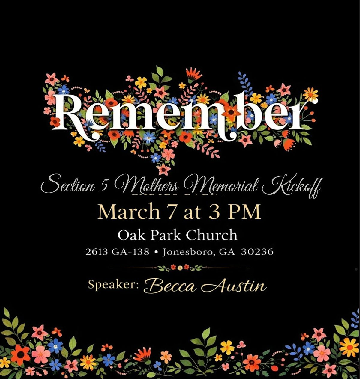 Join us for our Section 5 Mother’s Memorial Kick-Off Saturday, March 7, at 3:00 PM at Oak Park Church.