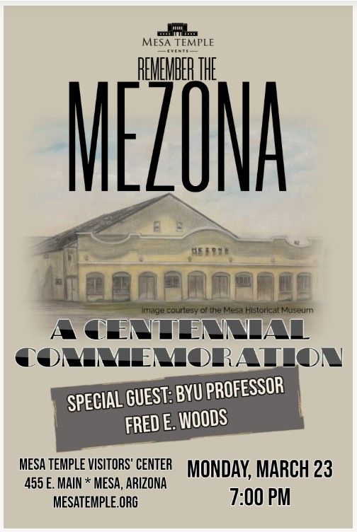 Join the Mesa Temple Visitors’ Center as we commemorate the 100-year anniversary of one of Mesa’s legends, the Mezona. BYU Professor Fred E. Woods will present stories and photos highlighting this important piece of local history. First built by farmer John T. Vance in 1908, the Church of Jesus Christ of Latter-day Saints purchased the building and renamed it the Mezona in 1926. According to the Mesa Tribune , during the 1940’s and 1950’s, the Mezona dance floors were where a good percentage of East Valley couples met, got engaged, or announced their engagements. This entertaining and informative event will be held at the Visitors’ Centeron Monday, March 23, at 7:00 PMand is free to attend. We look forward to your attendance!